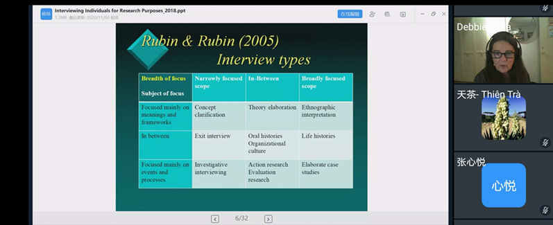 Deborah Gioia教授围绕“质性研究方法”这一主题,首先分析了质性研究的理论基础以及文化和伦理道德在质性研究中的地位和作用,并针对研究中可能存在的疑问或难题提出对策建议;其次,详细介绍了质性研究中的内外部视角以及几种主要的质性研究方法,并对学生选择研究问题和开展访谈等步骤进行指导,提倡学生在调查过程中既要保持客观性也要保持灵活性;最后,讲解了质性研究中的数据管理和数据分析方法,分享了四个质性研究热点主题。教学方式以老师讲授和学生参与讨论为主,在课堂互动环节,Deborah Gioia教授针对师生提出的问题,逐一进行了详实而深刻地回答。为加深学子理解课程内容,每一专题都提供相关的外文阅读文献,并布置随堂作业,批改后给学生提出反馈意见。